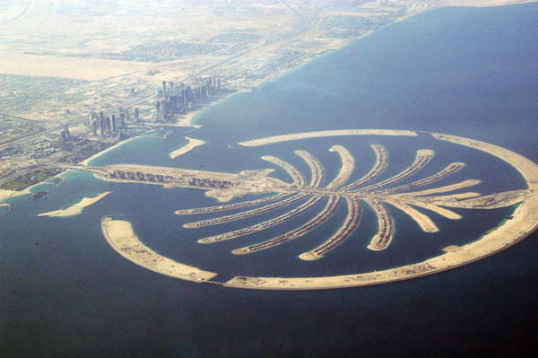 The Palm Jumeirah is the smallest of the three Palm Islands (Palm Jumeirah, Palm Jebel Ali and Palm Deira). It is located on the Jumeirah coastal area of the emirate of the Dubai, in the United Arab Emirates (UAE). The unique human-made island is built in the shape of a date palm tree and consists of a trunk, a crown with 17 fronds, and a surrounding crescent island that will form a water-breaker.